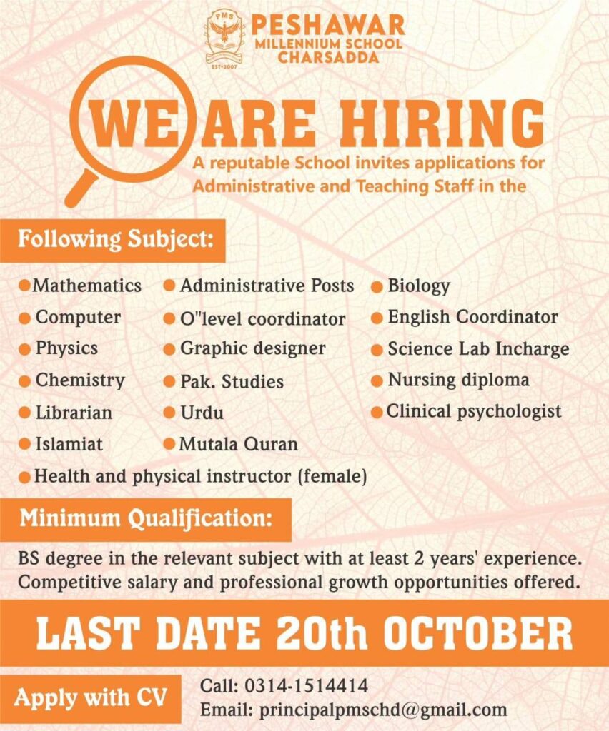 “Explore exciting career opportunities at Peshawar Millennium School, Charsadda. We are hiring administrative and teaching staff for various subjects including Mathematics, Science, English, and more. Apply by 20th October.”