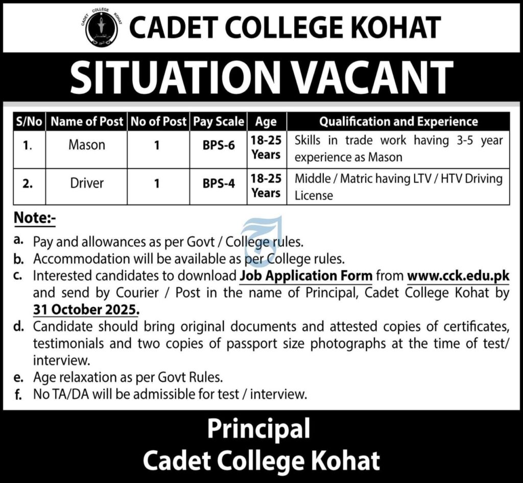 “Apply now for the Mason and Driver positions at Cadet College Kohat. Positions available with competitive pay and allowances. Apply by 31st October 2025.”
