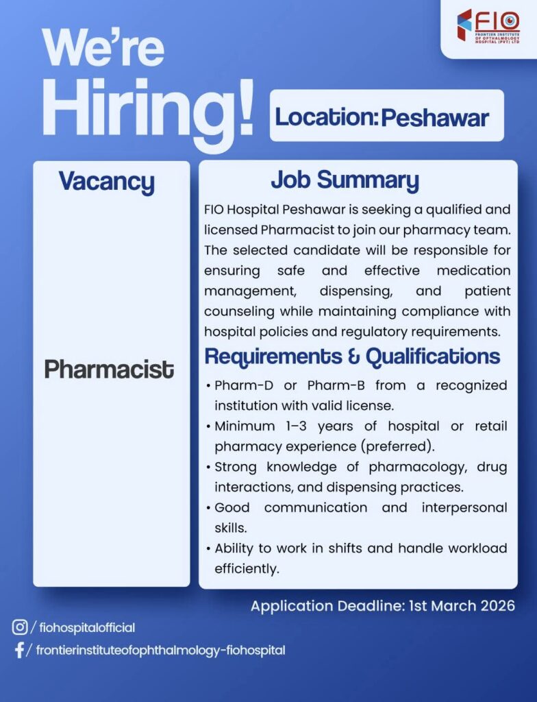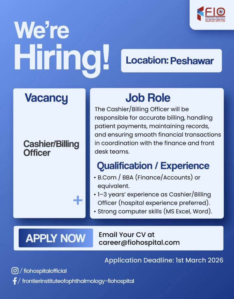 FIO Hospital Peshawar is hiring for multiple roles, including Contact Center Officer, Pharmacist, and Cashier/Billing Officer. Apply by 1st March 2026. Explore qualifications, experience requirements, and the application process.