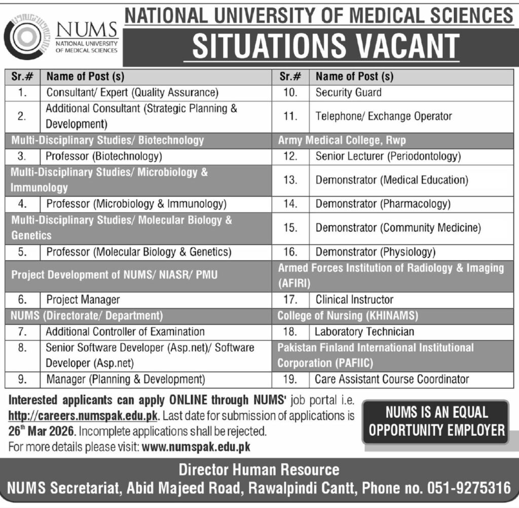 Job Opportunities at National University of Medical Sciences (NUMS) Rawalpindi