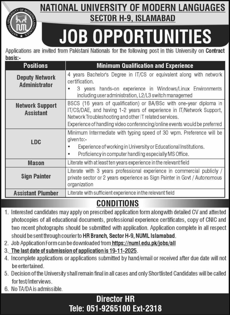 - How to Apply: Submit the prescribed application form along with a detailed CV, educational documents, and two recent photographs through courier to HR Branch, Sector H-9, NUML Islamabad.