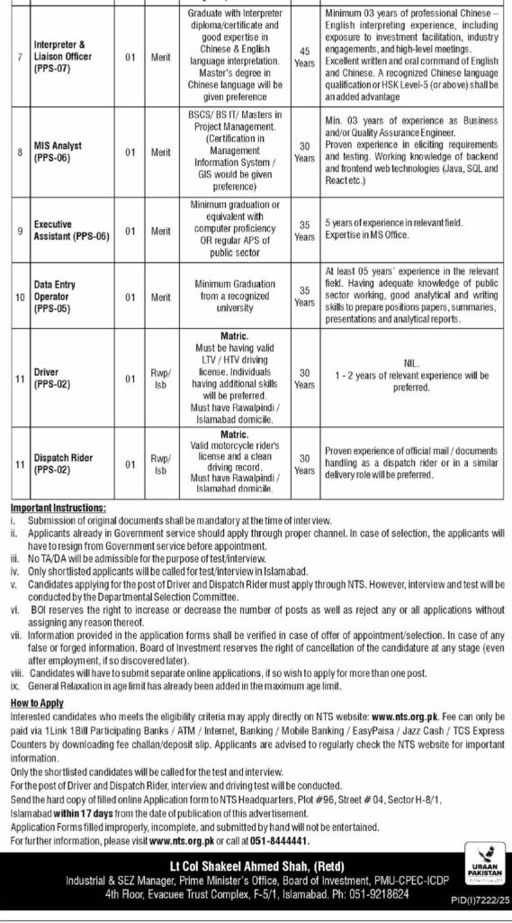 - Application Submission: Online through the NTS website. For positions of Driver and Dispatch Rider, submit applications via NTS and attend an interview in Islamabad.