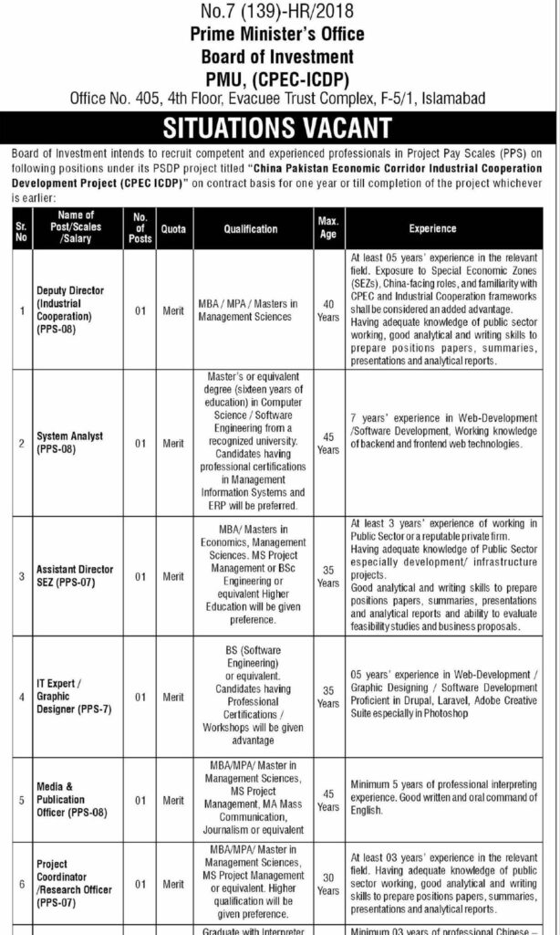 Explore the latest job openings at the Prime Minister’s Office, Board of Investment under the China Pakistan Economic Corridor (CPEC ICDP) project. Detailed qualifications, experience, and number of positions available. Apply now before the deadline!