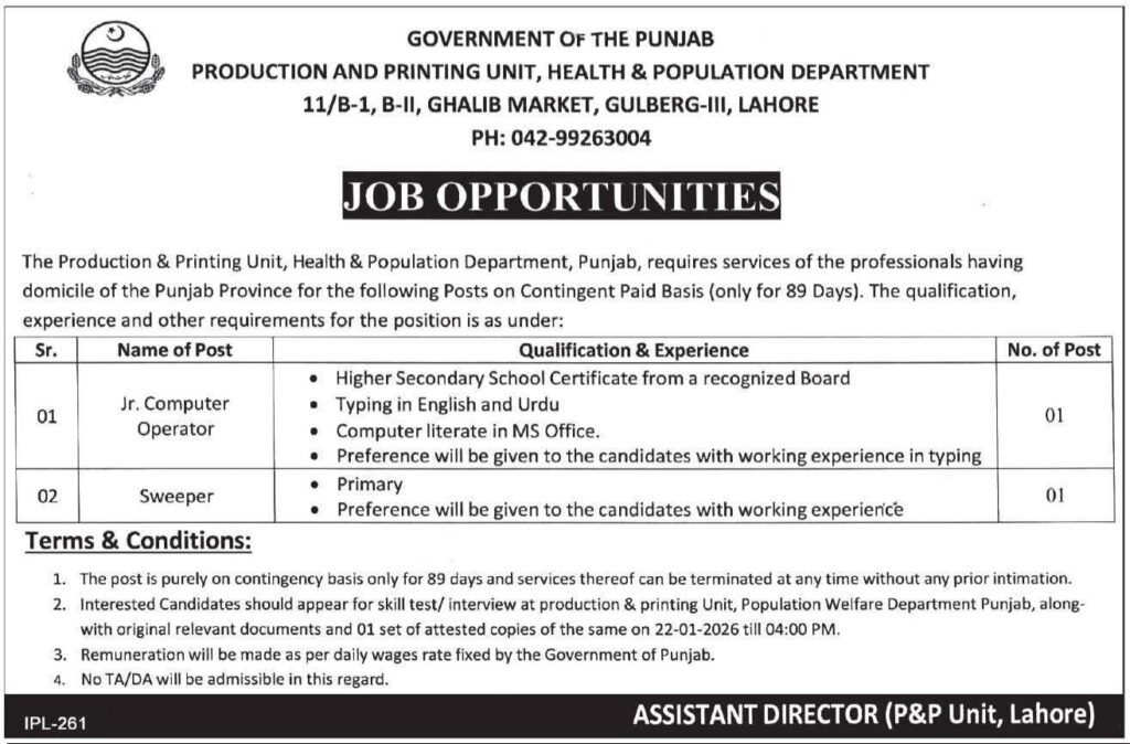 “Apply for government job vacancies at the Production & Printing Unit, Health & Population Department Punjab. Positions available for Jr. Computer Operator and Sweeper on a contingency basis for 89 days. Deadline: 22nd January 2026.”