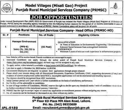 Explore exciting career opportunities with the Punjab Rural Municipal Services Company (PRMSC) under the Model Villages (Misali Gao) Project. Apply now for the Manager Environment position and be part of the sustainable development initiative in Punjab.