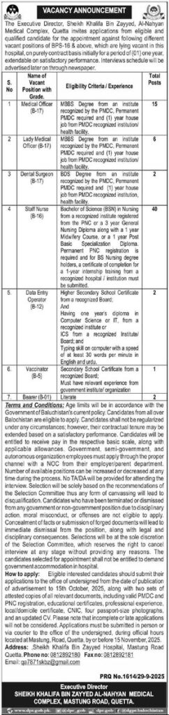 Sheikh Khalifa Bin Zayed Hospital in Quetta is hiring for various medical and administrative positions, including Medical Officer, Lady Medical Officer, Dental Surgeon, and Nurses. Explore the opportunities and apply by 15 November 2025. Full details and eligibility criteria included.
