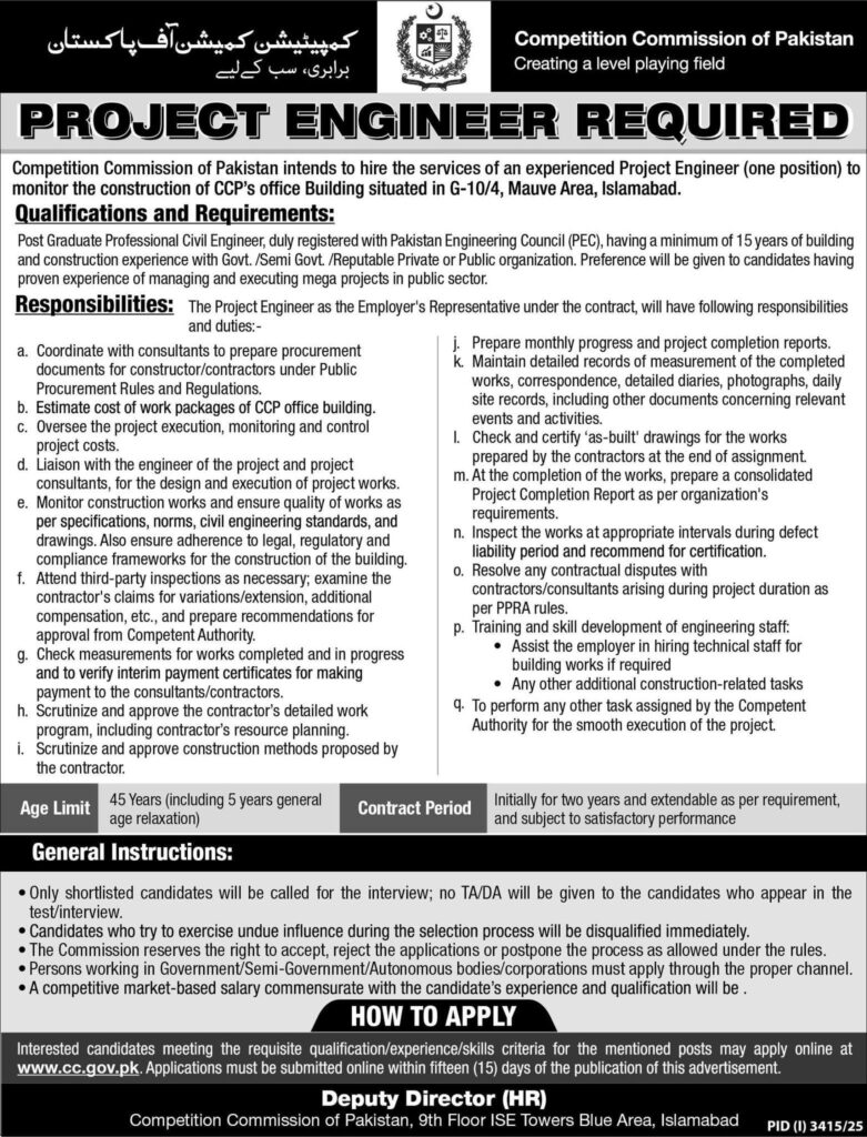 | 2 | Project Engineer | 01 | Post Graduate Civil Engineering, PEC Registration | 15 years in building and construction management | Max 45 years |