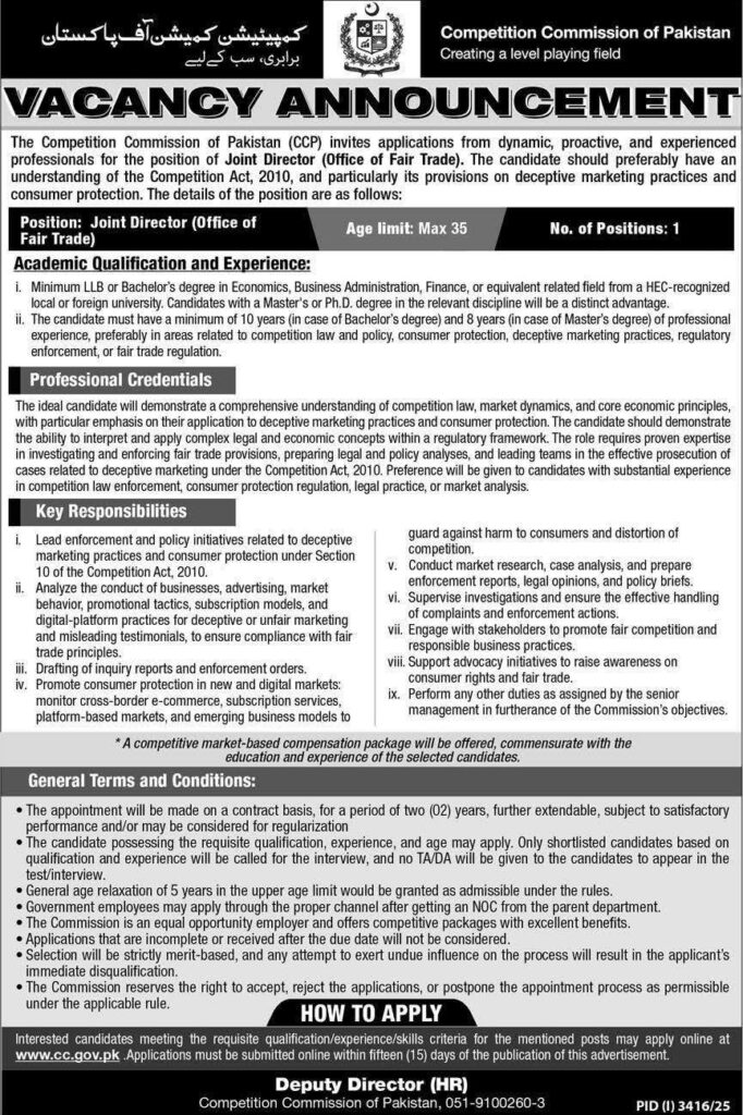 | 1 | Joint Director (Office of Fair Trade) | 01 | LLB or Bachelor’s degree in Economics, Business Admin, or Finance | 10 years (Bachelor’s) or 8 years (Master’s) in relevant field | Max 35 years |