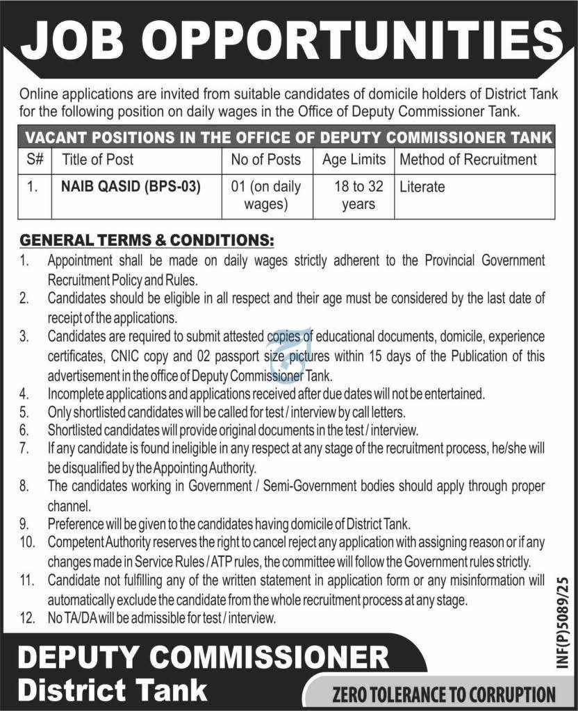 “Office of Deputy Commissioner Tank is hiring a Naib Qasid (BPS-03) on daily wages. Candidates with a District Tank domicile and aged 18 to 32 years are eligible. Apply by submitting required documents within 15 days.”