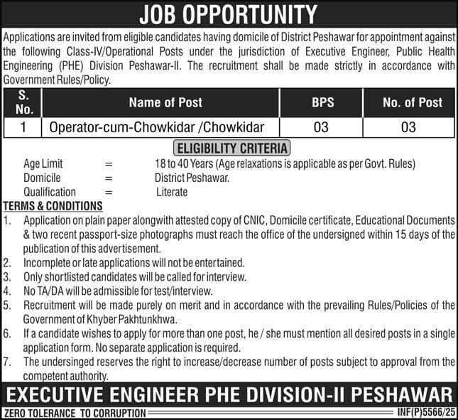 “Apply for Operator-cum-Chowkidar positions in Peshawar under the Public Health Engineering Division. Learn about the eligibility criteria, including age limit, domicile, and educational requirements. Submit applications by 15 days from the ad’s publication date.”