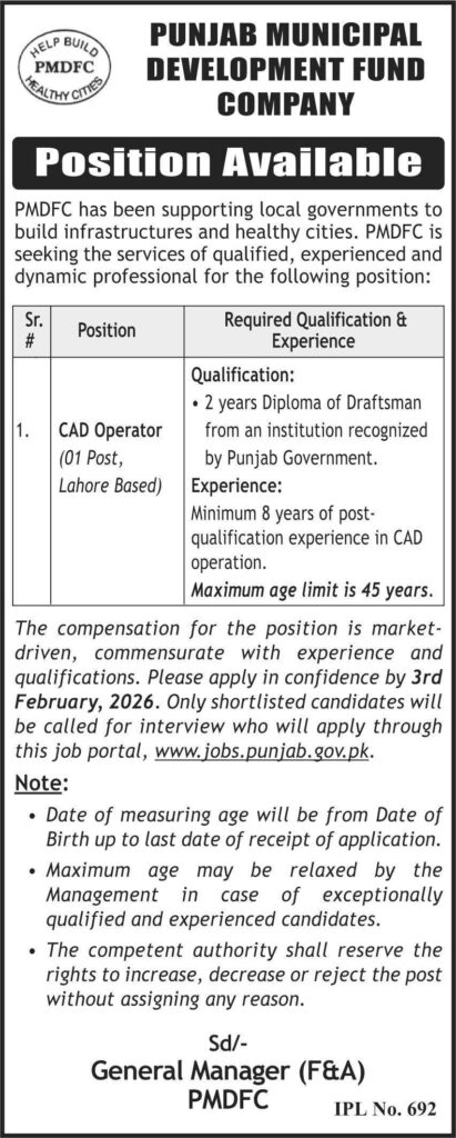Punjab Municipal Development Fund Company (PMDFC) is hiring a CAD Operator for Lahore-based position. Apply by February 3, 2026, for this opportunity. Minimum 8 years of experience required.