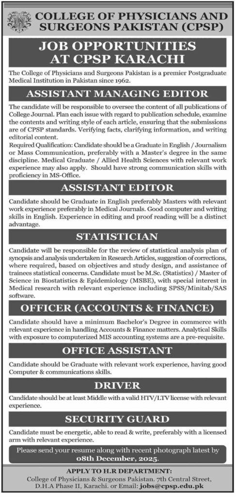 Explore job opportunities at CPSP Karachi for multiple positions including Assistant Managing Editor, Assistant Editor, Statistician, and more. Apply by 8th December 2025. Detailed job requirements listed.