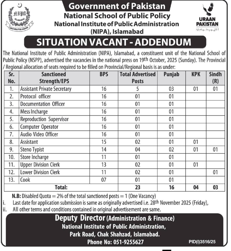 “Apply now for various positions at NIPA Islamabad including Assistant Private Secretary, Protocol Officer, Mess Incharge, and more. Competitive salary with posts available for Punjab, KPK, and Sindh regions. Last date to apply: 28th November 2025.”