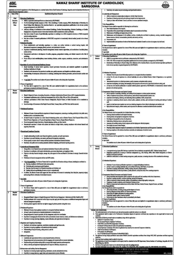 - How to Apply: Interested candidates should send their application along with required documents (CV, educational certificates, professional experience, and passport-size photos) to the Registrar Office at Nawaz Sharif Institute of Cardiology, Sargodha.