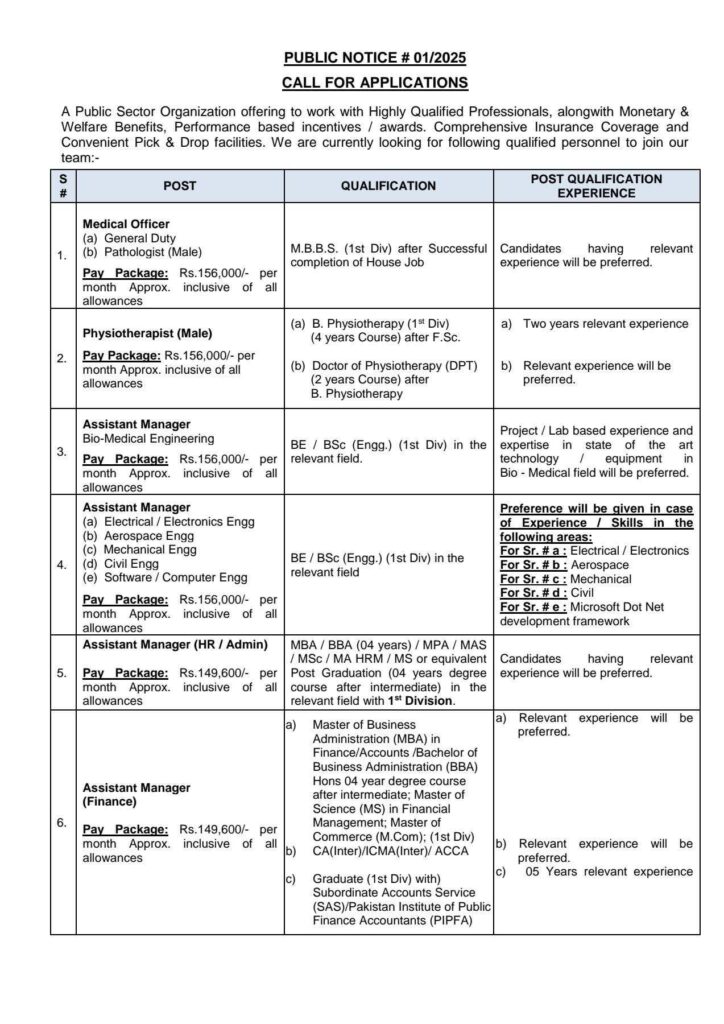 | 4 | Physiotherapist (Male) | 01 | BSc Physiotherapy (1st Division) or DPT (2 years course) after B.Physiotherapy | 02 years relevant experience | Max 35 years |
