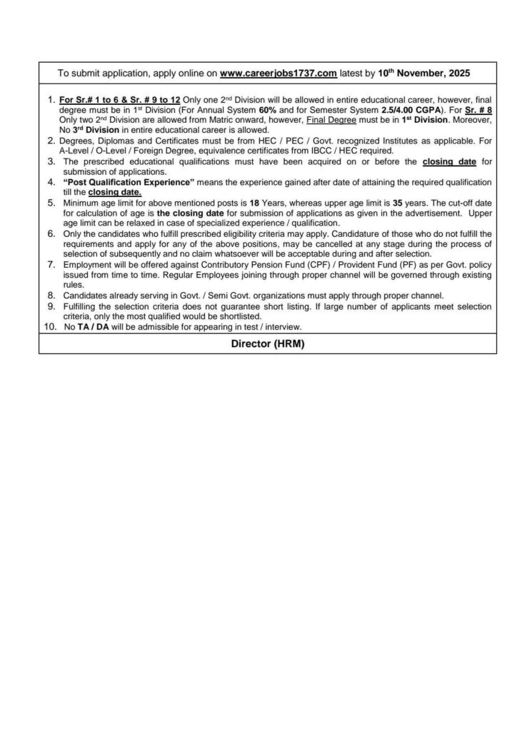 | 11 | Medical Officer (Pathologist) | 01 | MBBS (1st Division) with experience in Pathology | 02 years relevant experience | Max 35 years |