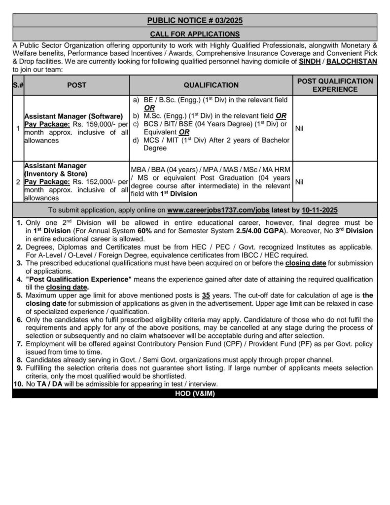 | 2 | Assistant Manager Collaboration | 01 | MBA/BBA (04 years) / MPA / MSc / MA HRM / MS | Nil | Max 35 years |