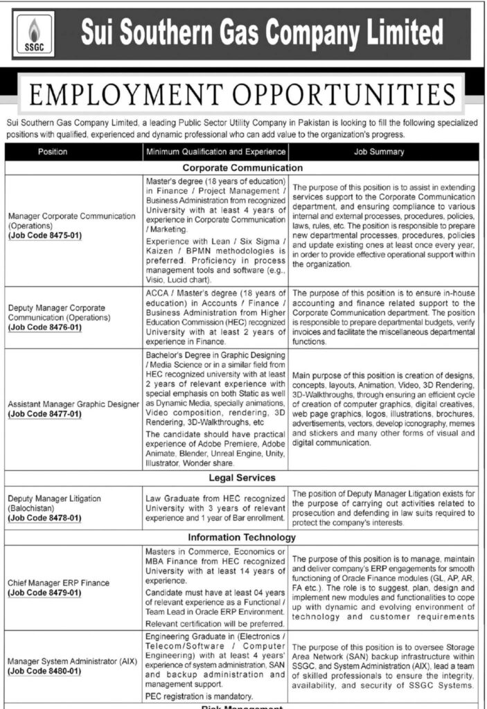 Apply for exciting career opportunities at Sui Southern Gas Company Limited (SSGC). Positions available for Manager Corporate Communication, Deputy Manager IT, and more. Apply by November 10, 2025. Competitive salary and growth opportunities.