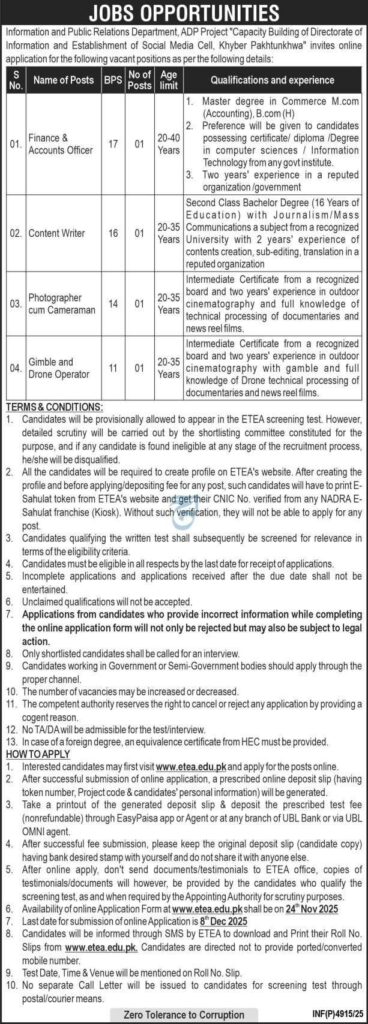 Explore job opportunities in Khyber Pakhtunkhwa under the ADP Project for positions in Finance, Content Writing, Photography, and more. Apply by 8th December 2025 for government jobs in the Information & Public Relations Department.