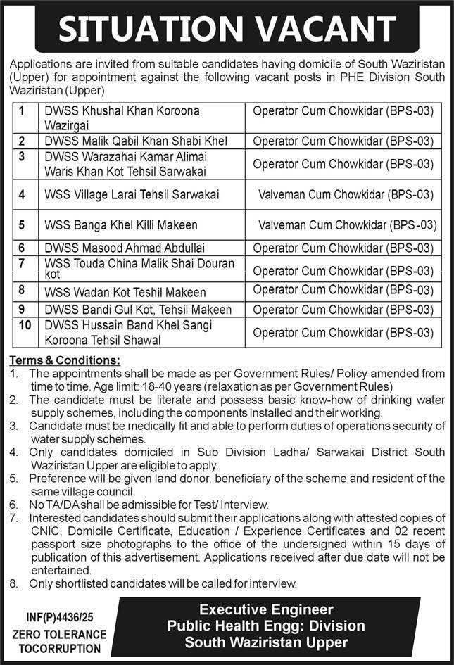 - Interested candidates should submit their applications with the required documents (CNIC, Domicile, educational certificates, and passport-sized photos) to the office of the Executive Engineer, Public Health Engineering Division, South Waziristan.