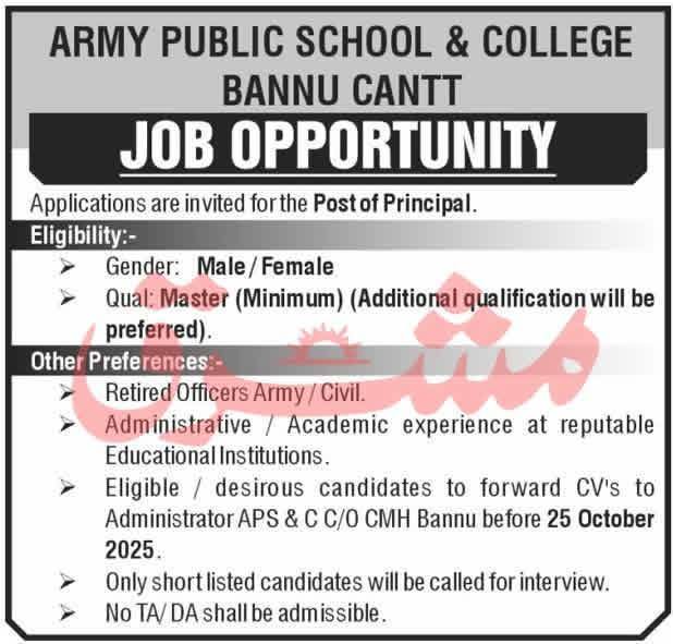 “Apply now for the Principal position at Army Public School & College, Bannu Cantt. If you meet the eligibility criteria with a Master’s qualification and relevant administrative experience, submit your CV before 25th October 2025.”