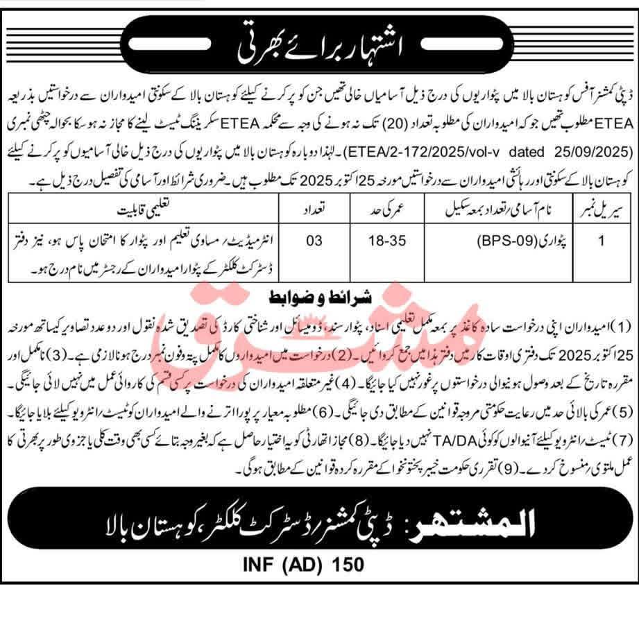 “Apply now for the available position of Chowkidar (BPS-09) at the Deputy Commissioner Office, Kohistan. Candidates between 18 to 35 years with the required qualifications can apply by 25th October 2025. Learn more about eligibility and application process.”