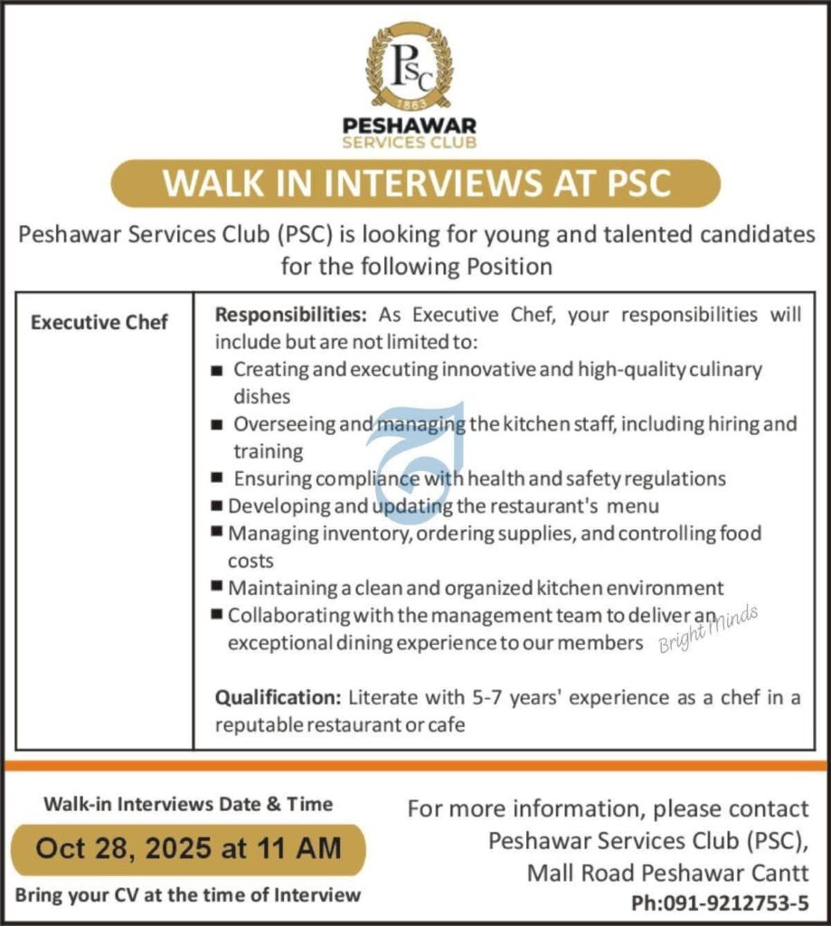 Peshawar Services Club is hiring an Executive Chef for their kitchen team. Candidates with 5-7 years of experience in a reputable restaurant or café are encouraged to apply. Walk-in interviews on 28th October 2025.