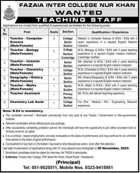 Fazaia Inter College Nur Khan is hiring qualified and experienced teaching staff for multiple subjects. Apply by 30th November 2025 for Computer Science, Biology, Chemistry, and other positions.
