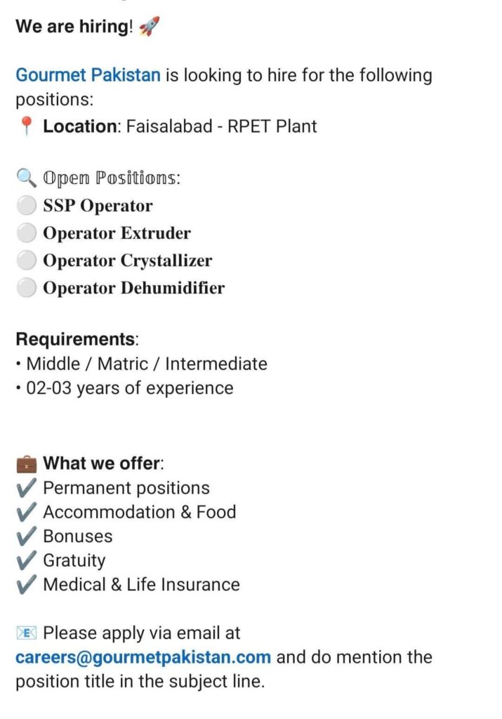 “Gourmet Pakistan is hiring for multiple positions at its Faisalabad RPET Plant. Positions available for SSP Operators, Extruder Operators, Crystallizer Operators, and Dehumidifier Operators. Apply now for permanent jobs with attractive benefits like accommodation, bonuses, and medical insurance.”