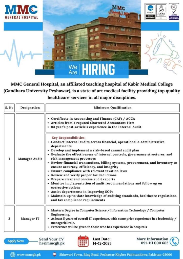 “MMC General Hospital is hiring qualified professionals for key positions like Manager Audit and Manager IT. Explore exciting career opportunities in healthcare services and apply today!”