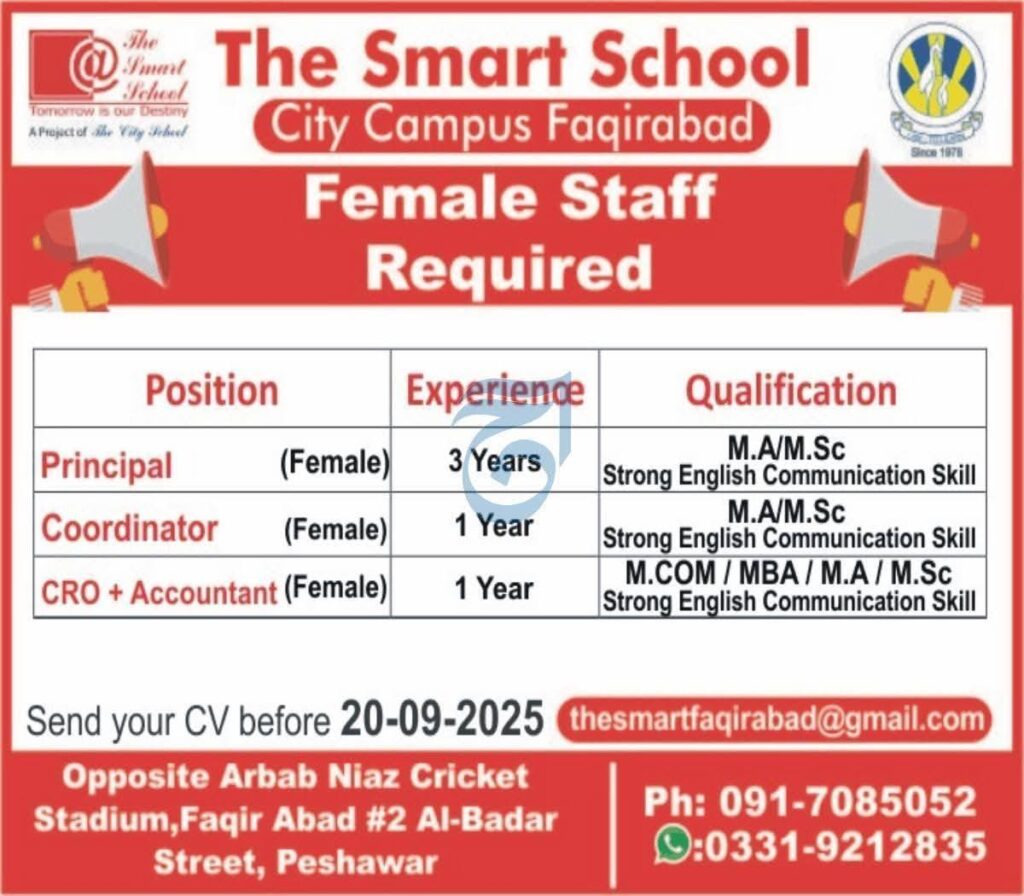 Are you looking for a rewarding career in education? The Smart School City Campus Faqirabad is currently hiring motivated and qualified female staff for multiple positions. We offer a collaborative work environment and are looking for candidates with strong English communication skills. Apply today to become a part of our esteemed institution. Send your CV before 20-09-2025.