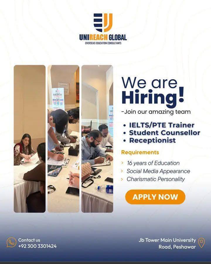 UniReach Global is expanding its team! We are looking for passionate and dedicated individuals for the roles of IELTS/PTE Trainer, Student Counsellor, and Receptionist. Ideal candidates should have 16 years of education, a strong social media presence, and a charismatic personality. If you are ready to contribute to our growing team and help students achieve their dreams of studying abroad, apply today!