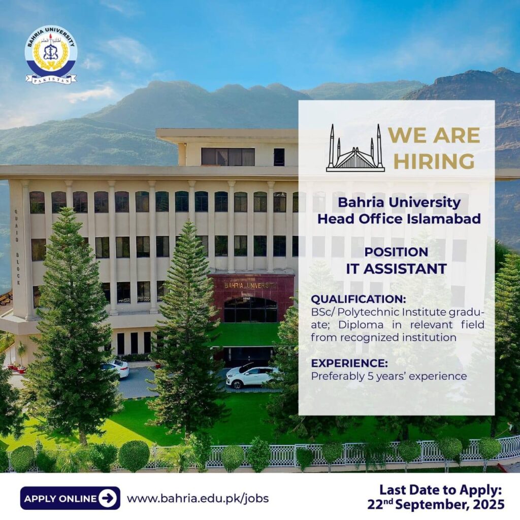 | IT Assistant | BSc/ Polytechnic Graduate, Relevant Diploma | Preferably 5 years | Bahria University, Islamabad | 22nd September, 2025 |