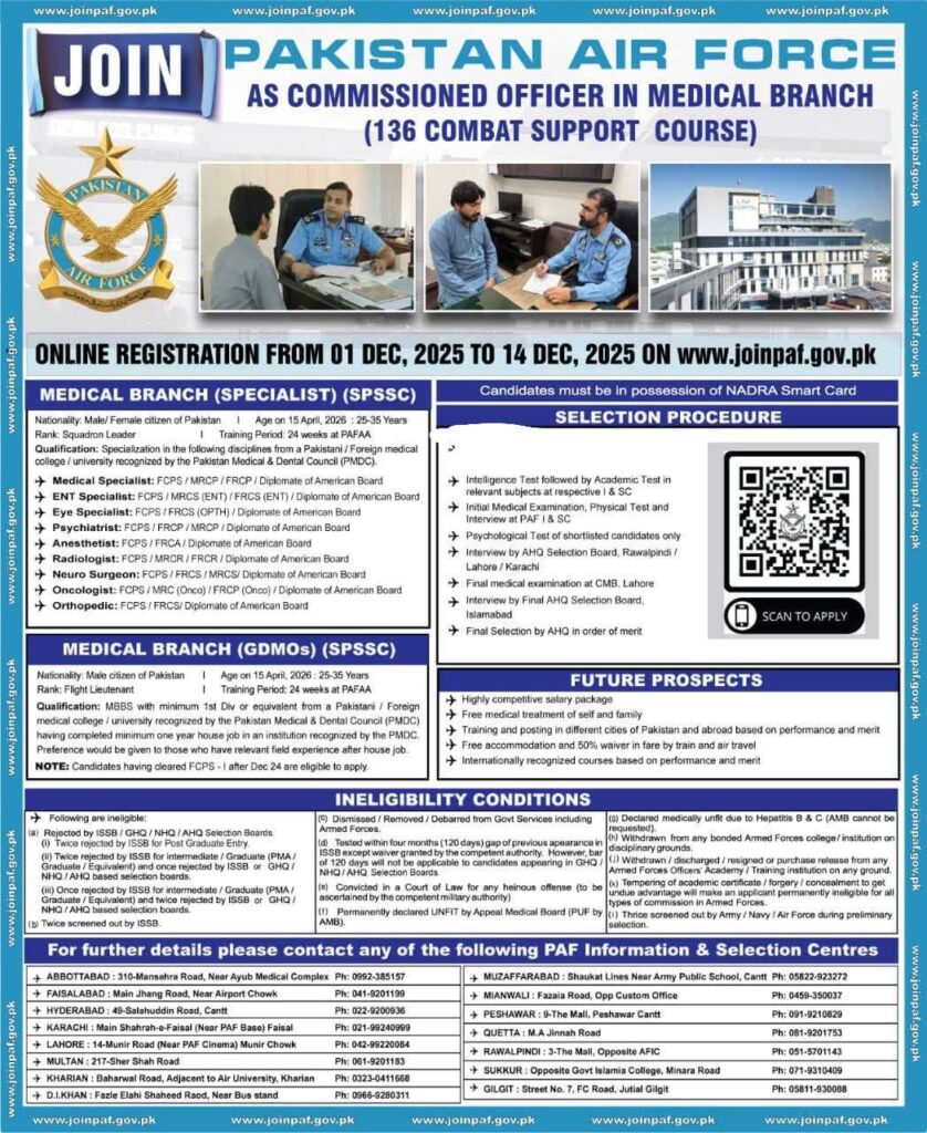 “Apply online for the Pakistan Air Force Commissioned Officer positions in the Medical Branch. Get details about the application process, available roles, eligibility requirements, and future career prospects. Don’t miss the opportunity to serve with the PAF!”