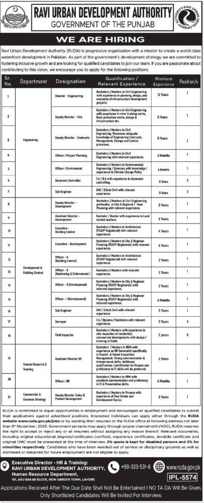 “Ravi Urban Development Authority (RUDA) is hiring for multiple positions including Director, Deputy Director, Engineers, HR, and more. Apply now for a career in urban development with competitive benefits. Deadline to apply: 9th November 2025.”