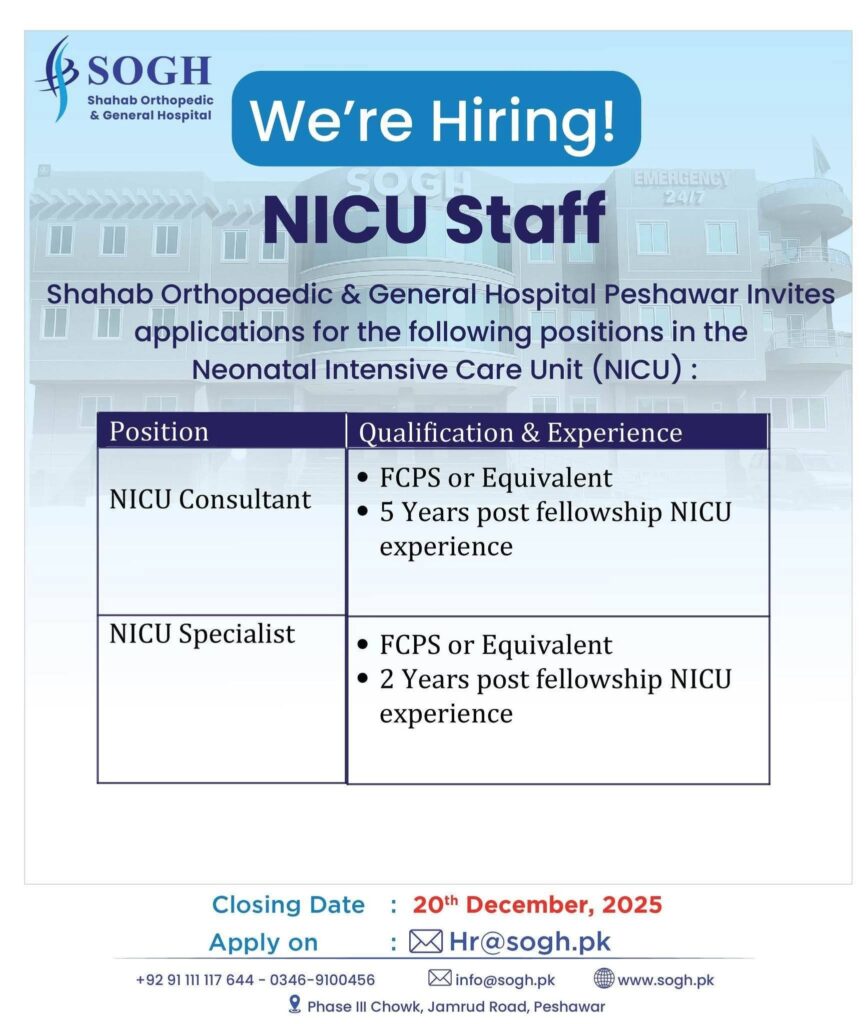 “Shahab Orthopedic & General Hospital in Peshawar is hiring NICU Consultants and NICU Specialists. Apply by 20th December 2025 for these exciting healthcare career opportunities. Join a leading hospital for advanced neonatal care!”