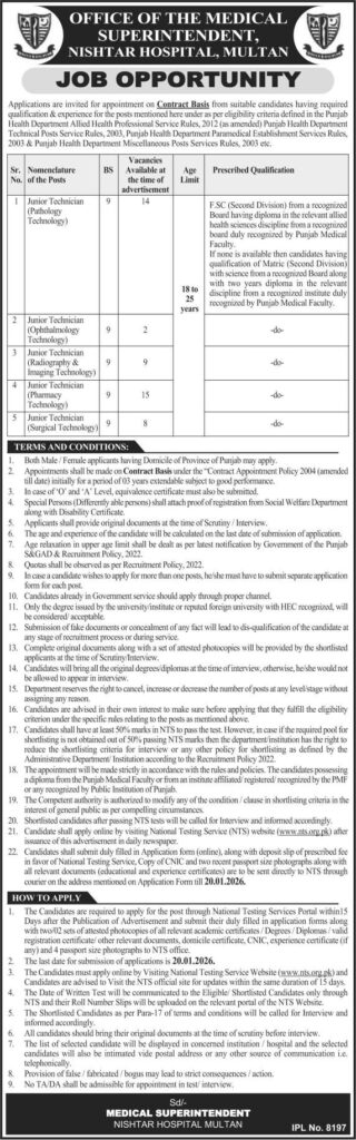 Nishtar Hospital Multan announces Junior Technician jobs on contract basis in pathology, radiology, pharmacy, and surgical technology. BPS-09 healthcare vacancies for Punjab domicile candidates. Apply before January 20, 2026.