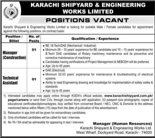 Apply for Karachi Shipyard & Engineering Works Limited (KSEW) Jobs 2025 in Karachi. Vacancies open for Manager (Construction) and Technical Assistant. Contract-based positions with attractive benefits. Apply before the deadline through the official website.