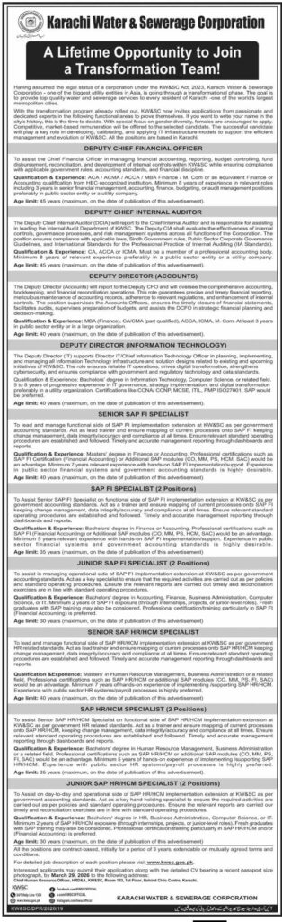 Apply for Karachi Water & Sewerage Corporation Jobs 2026. Explore SAP, Finance, IT, and Audit vacancies with eligibility criteria, qualifications, experience, and application details in Karachi.