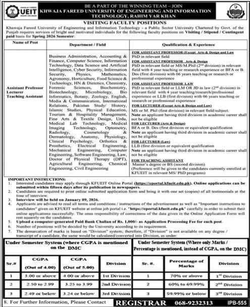 “Khwaja Fareed University of Engineering and Information Technology is offering visiting faculty positions in various departments like Business Administration, Computer Science, and Engineering. Apply for Assistant Professor, Lecturer, and Teaching Assistant roles by January 19, 2026.”