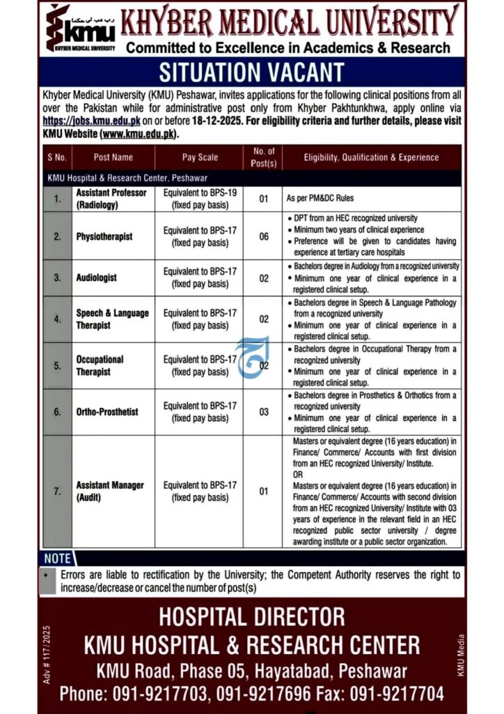 Apply for clinical and administrative positions at Khyber Medical University (KMU), Peshawar. Positions include Assistant Professor, Physiotherapist, Audiologist, Speech & Language Therapist, and more. Applications for administrative positions are open to KPK residents. Submit your applications by 18th December 2025.