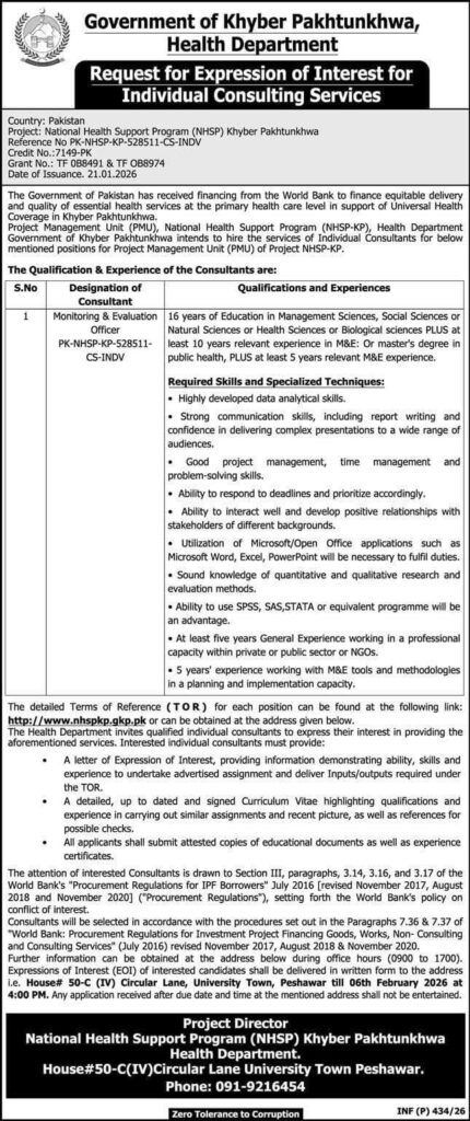 Khyber Pakhtunkhwa Health Department seeks qualified consultants for the Monitoring & Evaluation Officer position under the National Health Support Program. Apply by February 6, 2026.