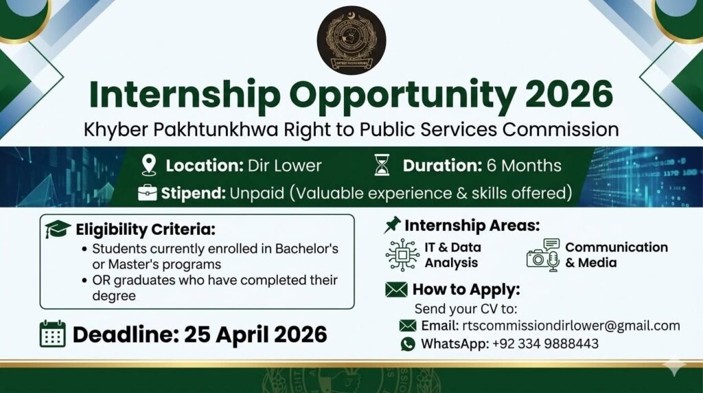 Apply for Khyber Pakhtunkhwa RTPSC Internship 2026 in Dir Lower. Explore IT, Data Analysis, and Media internship roles for students and fresh graduates. Deadline 25 April 2026.