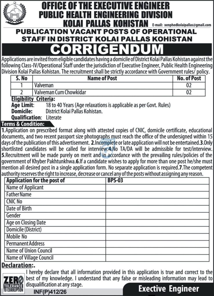Public Health Engineering Department, Kohistan invites applications for Valmen and Valmen Cum Chowkidar positions. Apply by submitting your documents within 15 days. Check eligibility and qualifications.