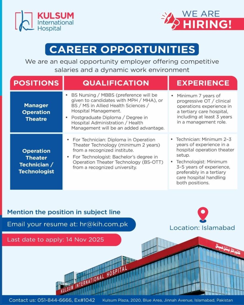 Explore latest Kulsum International Hospital Jobs 2025 in Islamabad. Apply for Manager Operation Theatre & OT Technician/Technologist before 14 Nov 2025.