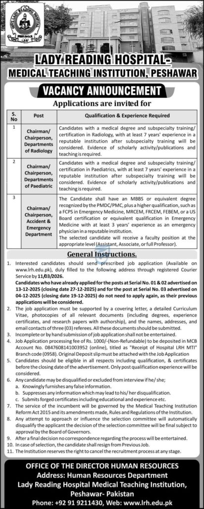 Apply for Chairman positions at Lady Reading Hospital, Peshawar. Openings in Radiology, Paediatrics, and Emergency Departments. Full details on qualifications, experience, and application deadlines.