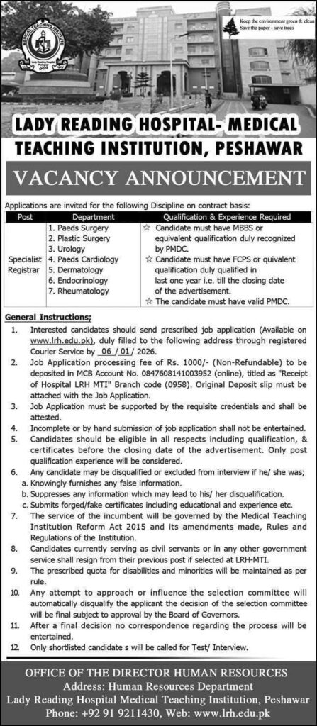 “Lady Reading Hospital in Peshawar is seeking qualified candidates for various medical specialist positions, including Paeds Surgery, Plastic Surgery, Urology, and more. Apply by January 6, 2026, for this exciting contract-based opportunity.”