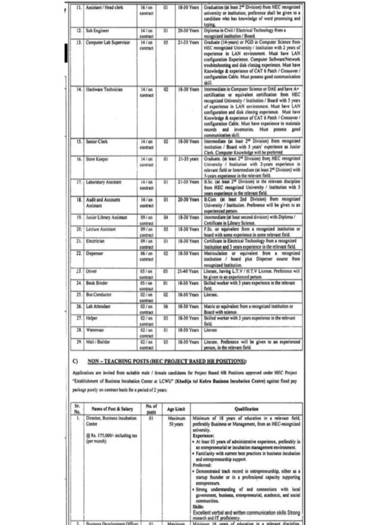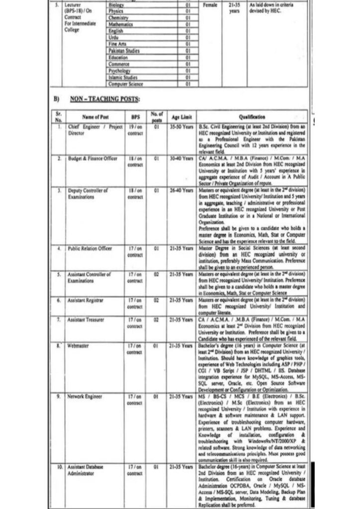 Lecturer (BPS-18)Computer Science, Physical Education, Fine Arts, etc.1-6 per subjectFemale21-35 yearsAs per HEC criteria