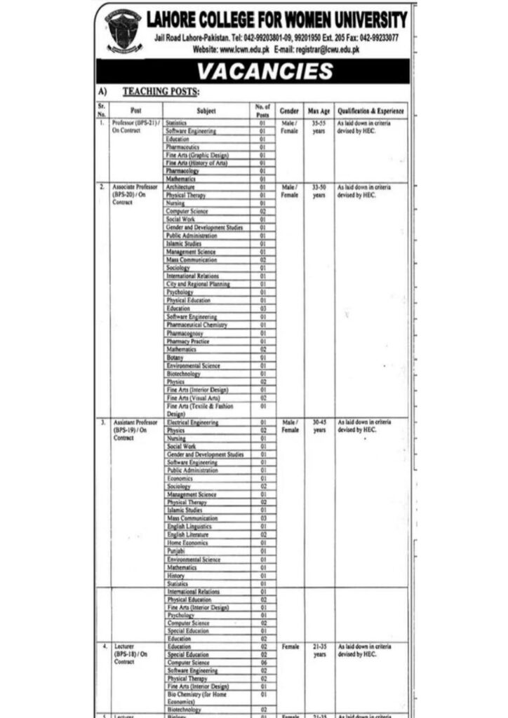 Lahore College for Women University is hiring Professors, Associate Professors, and Lecturers for various disciplines in 2025. Apply for positions in Software Engineering, Pharmacy, Management, and more.