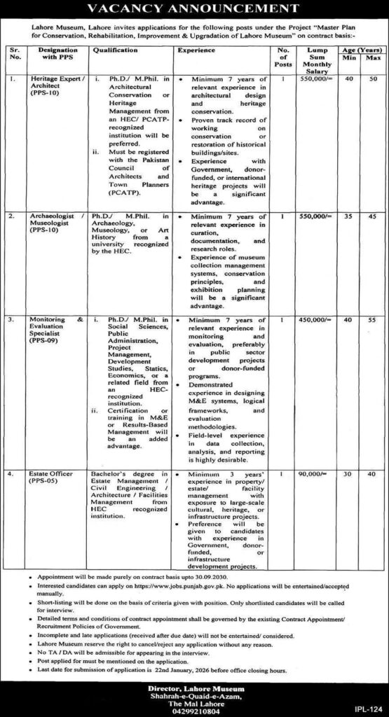 “Lahore Museum invites applications for various roles under the Master Plan for Conservation, Rehabilitation, and Upgradation of the Museum. Available positions include Heritage Expert, Archaeologist, Monitoring & Evaluation Specialist, and Estate Officer. Apply by 22nd January 2026 for these prestigious contract-based roles.”
